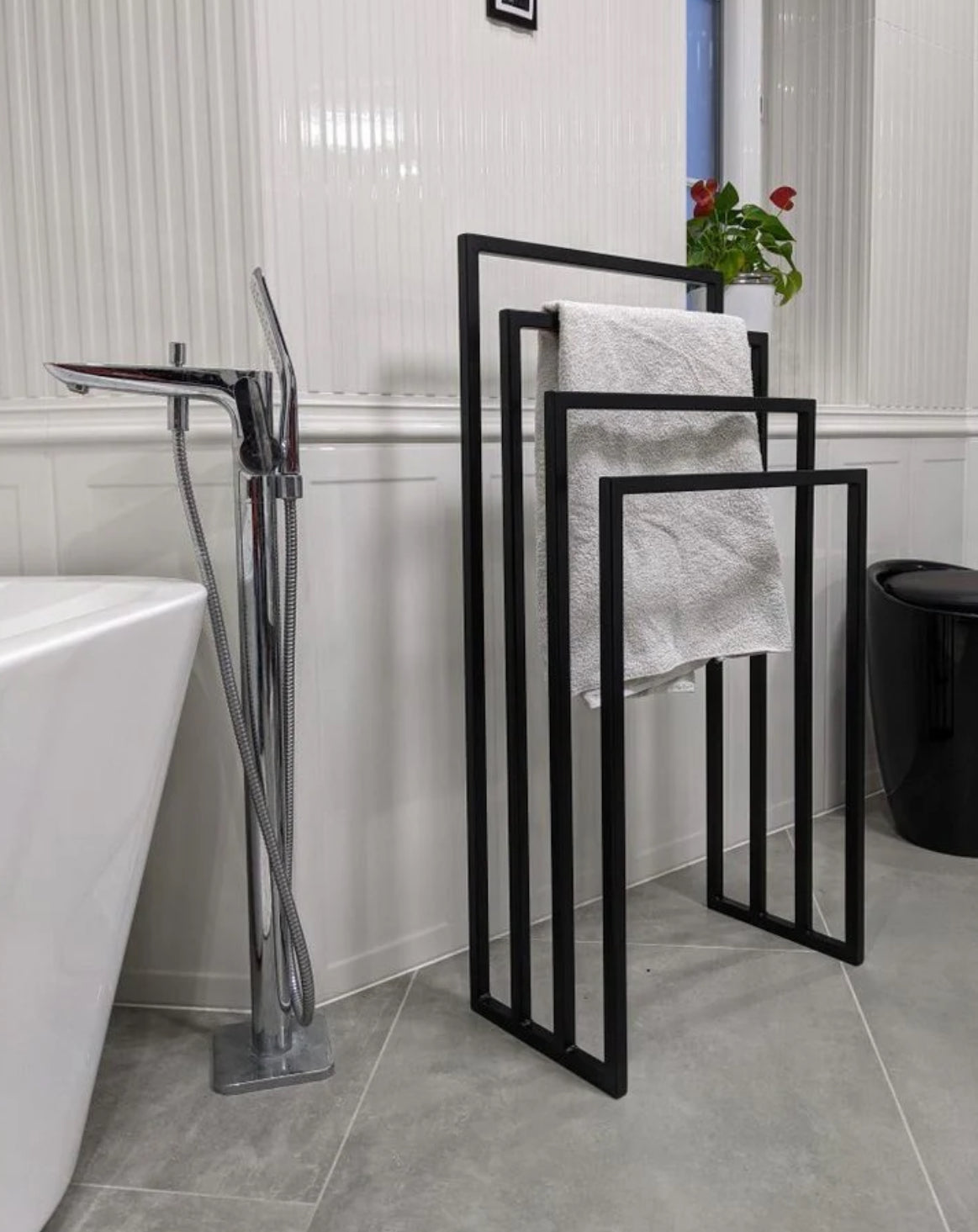 The square metal butler rack places three bath towels on the wall. Smart and design.