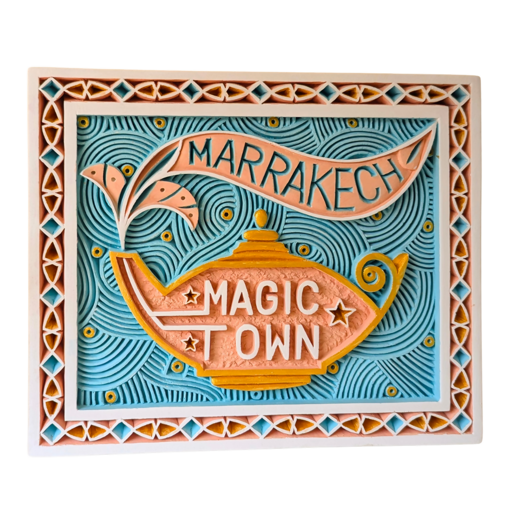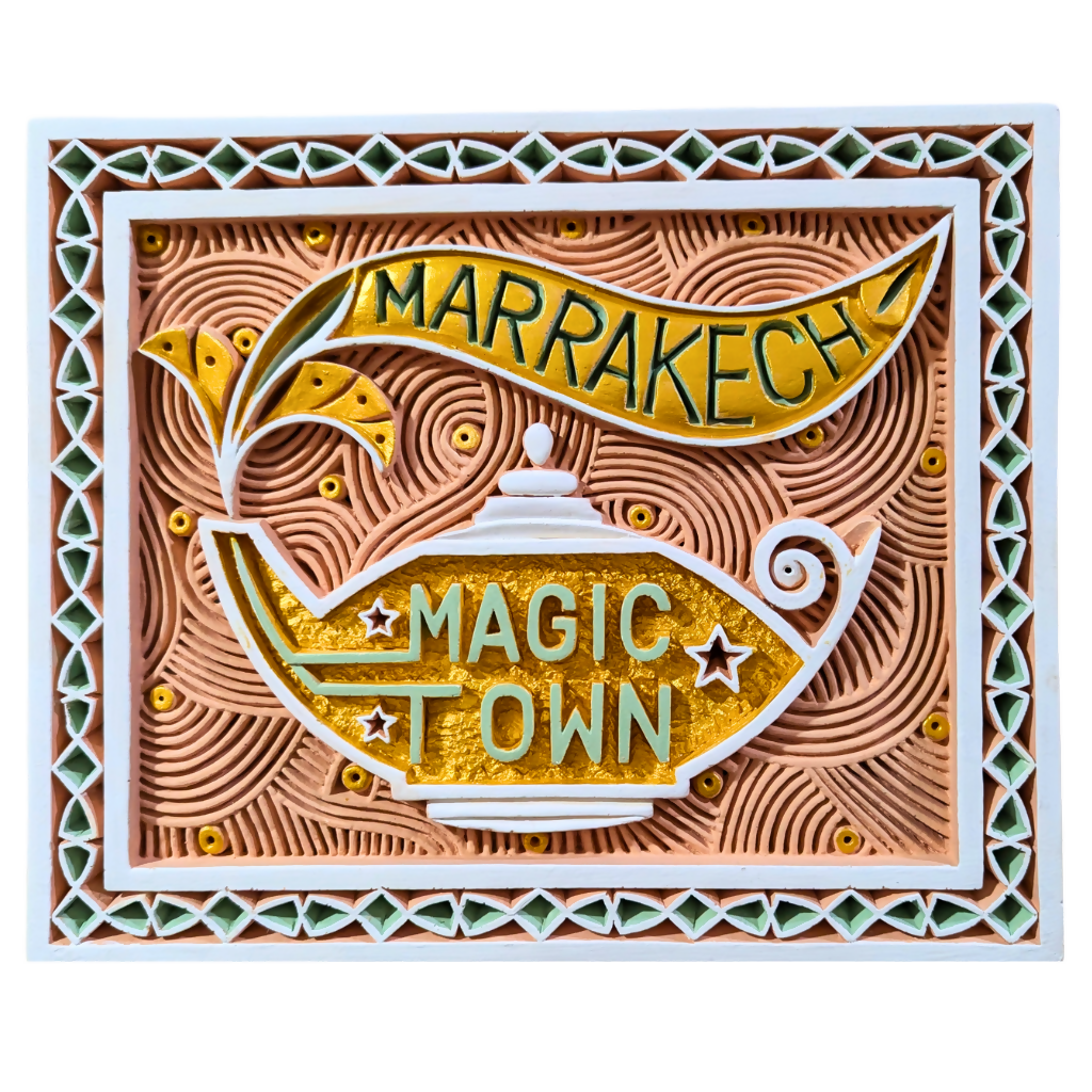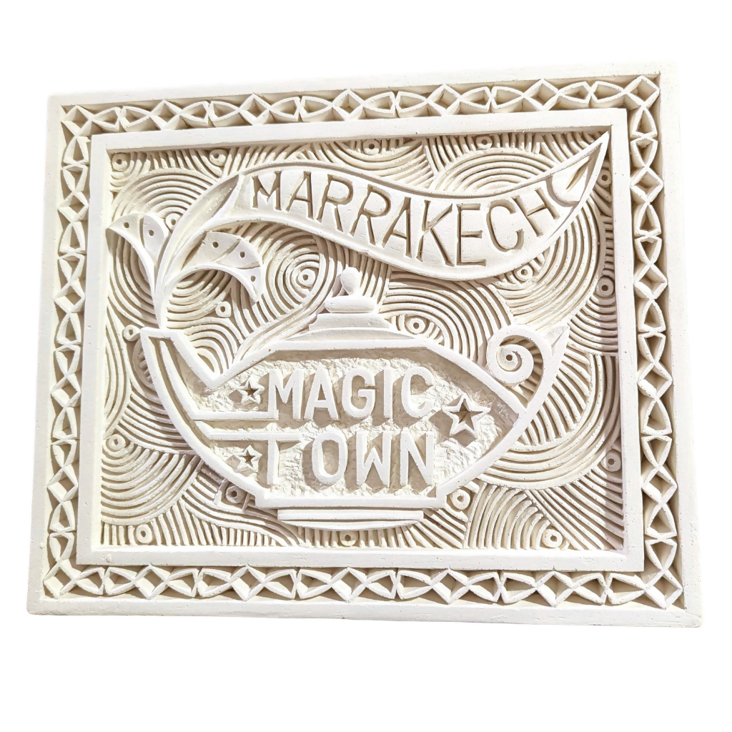 A with mix of calligraphy script “ Marrakech / Magic Town “ , and Natural/floral ornamentation designs , With the Famous “ Genie's lamp “ Motif (alternatively referred to as the Magic Lamp or Aladdin's lamp) , All In one unique carving plaster Wall Decor .
