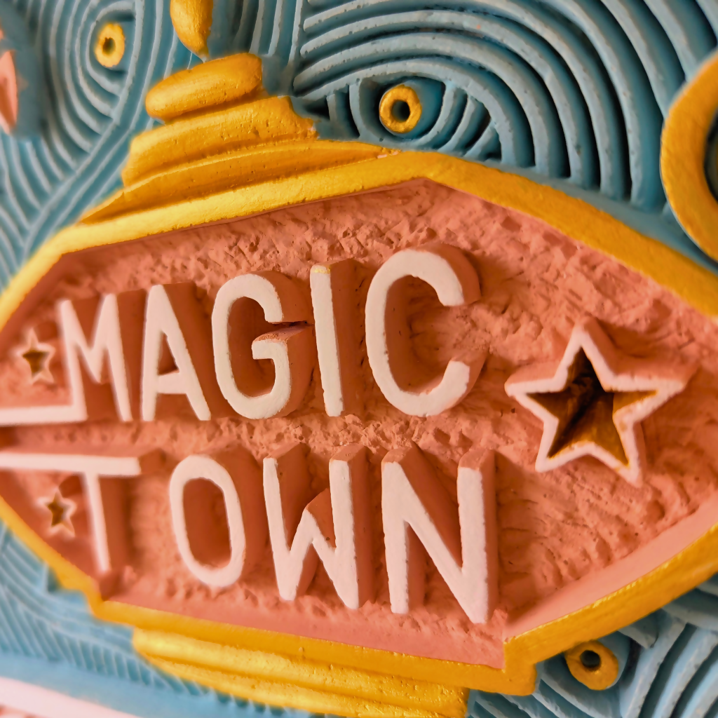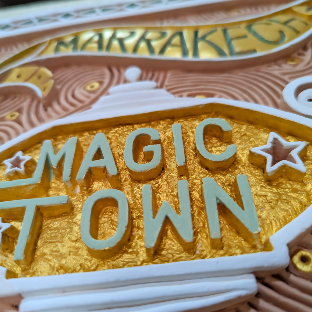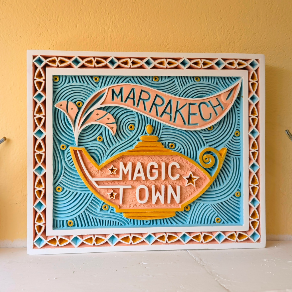 A with mix of calligraphy script “ Marrakech / Magic Town “ , and Natural/floral ornamentation designs , With the Famous “ Genie's lamp “ Motif (alternatively referred to as the Magic Lamp or Aladdin's lamp) , All In one unique carving plaster Wall Decor .