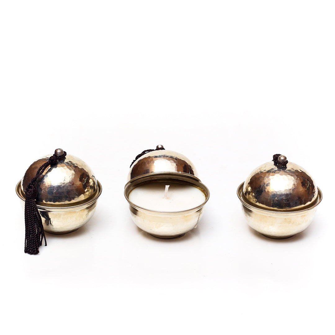 Beige leather box with ivory brown shaped wooden lid containing 4 luna candles.