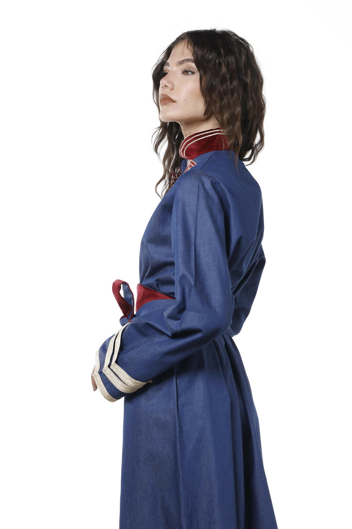 This mid-length kimono coat is a perfect fusion of modern 100% cotton denim and rich details inspired by oriental attire.