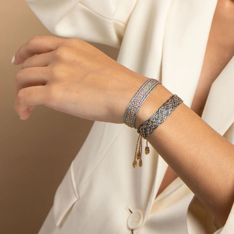Added a pop of color to the Izy bracelet. Here, we've merged purple, green and gold - and it's our best-seller!